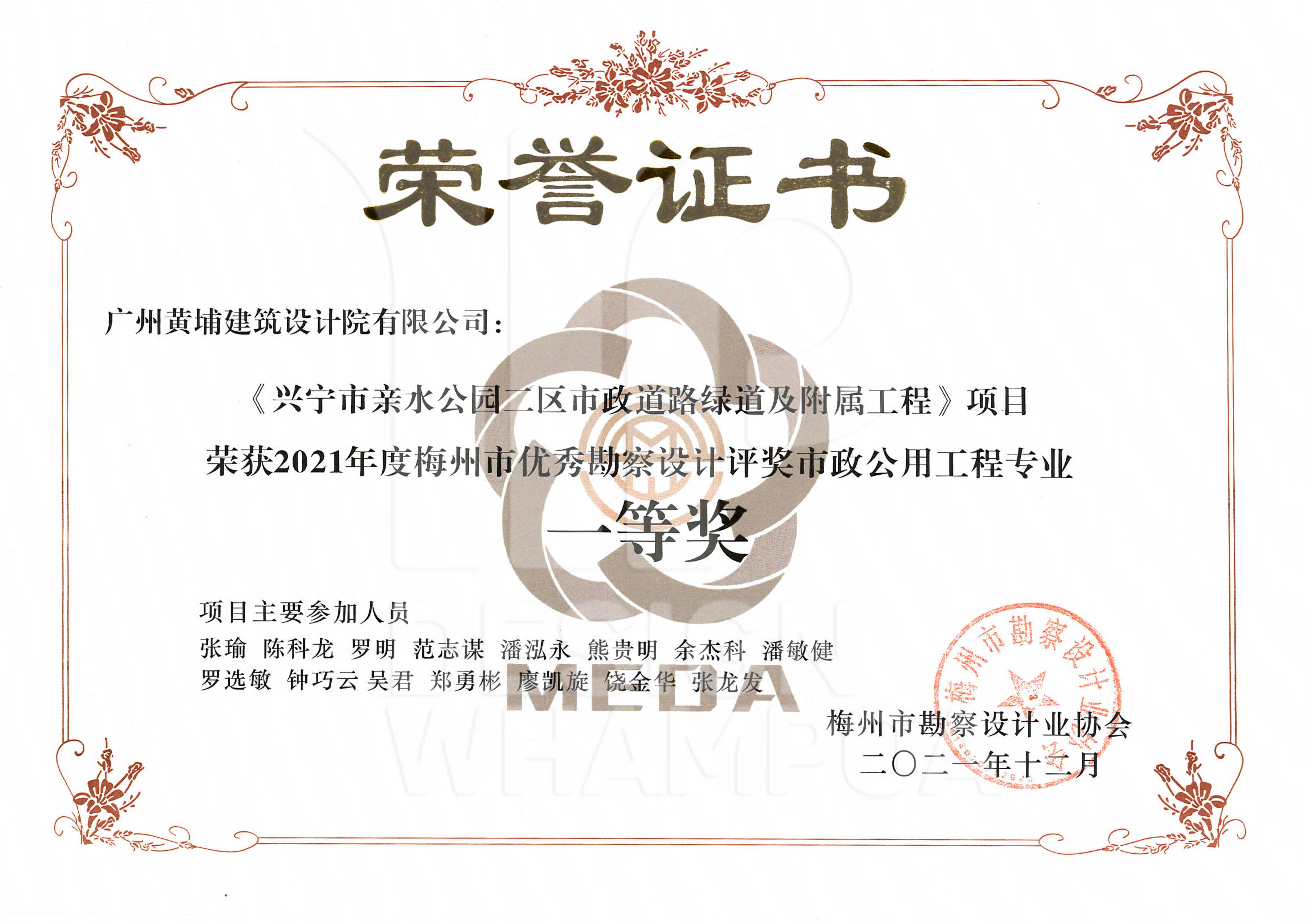 2021年度梅州市優(yōu)秀勘察設(shè)計(jì)評(píng)獎(jiǎng)市政公用工程專業(yè)一等獎(jiǎng)