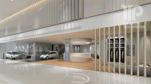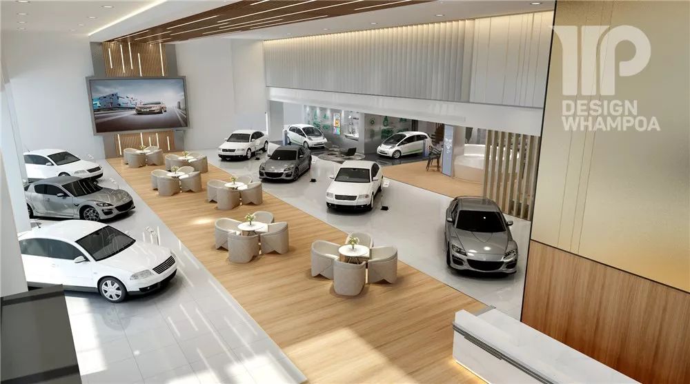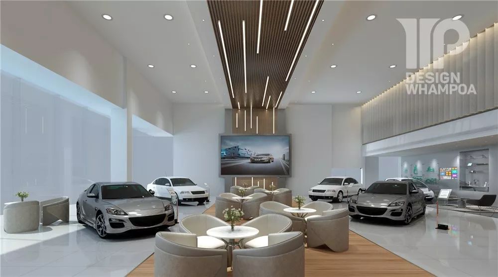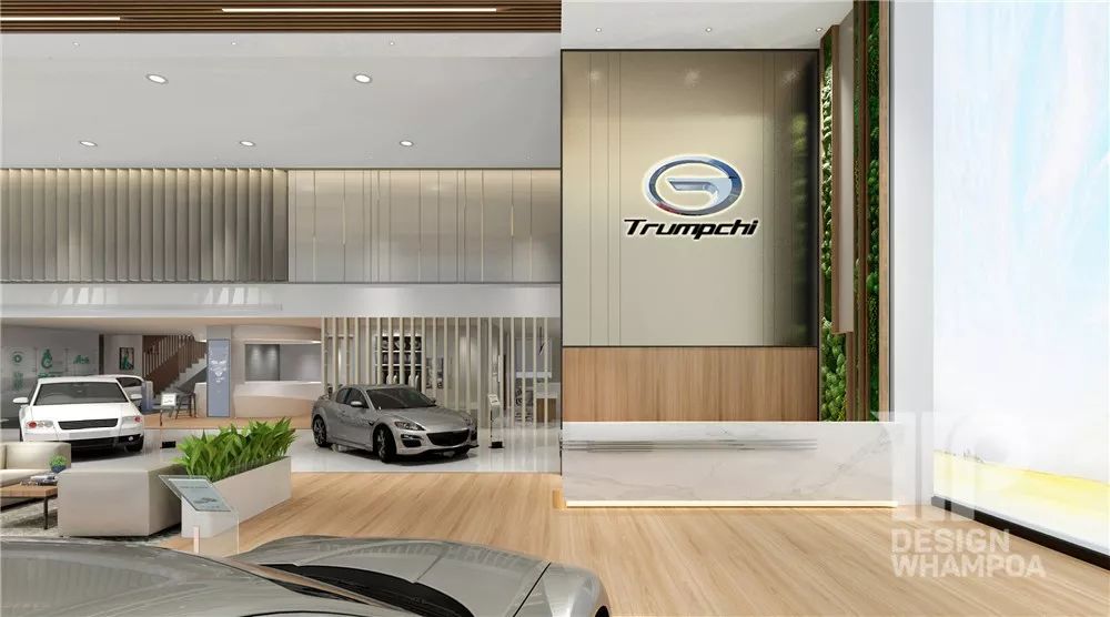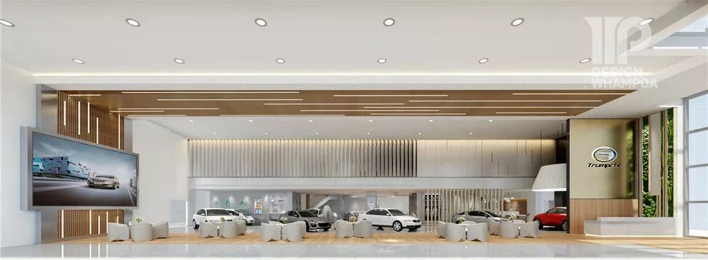 入口接待區(qū)進去是開放式展廳,中間一排為洽談區(qū),左右兩側(cè)為車輛展示區(qū)。而天花、地面、墻體的設(shè)計融合形成“賓客走廊”,將展廳自然而規(guī)整地劃分出清晰布局。