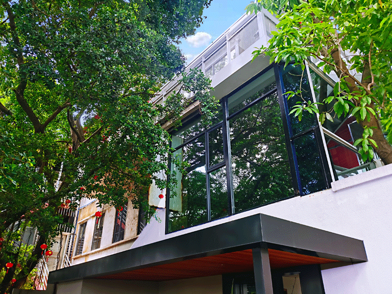 設(shè)計(jì)師通過(guò)非常靈活的結(jié)構(gòu)改造,在一樓預(yù)留了一個(gè)院子。院子不僅最大程度延伸了人的活動(dòng)空間,利用內(nèi)外相互兼顧的樹(shù)蔭和采光,提供了與自然的接觸,并揭示出自然的各個(gè)方面,是工作生活的中心,也是一個(gè)隱藏在現(xiàn)代城市日趨消逝的風(fēng)、雨、聲、光等自然物的一種裝置,它滿足了都市人對(duì)院子的奢望和渴求,聽(tīng)著樹(shù)葉嘩嘩作響,看著陽(yáng)光透過(guò)樹(shù)蔭滲入院中,在墻上和地上投下忽明忽暗的光影,更賦予了空間的生命力與朝氣。
