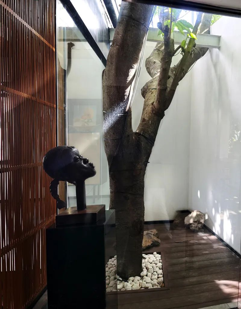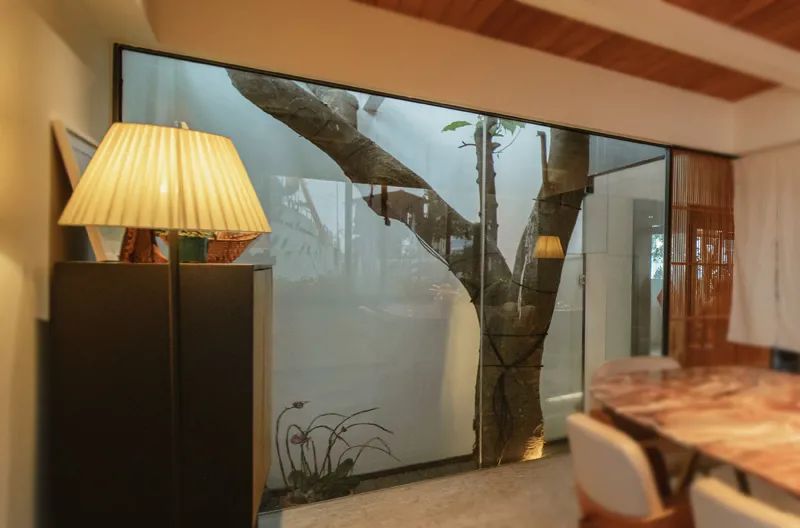 首層室內(nèi)玻璃盒子天井,讓白玉蘭樹(shù)和室內(nèi)外的空間,形成互動(dòng)和關(guān)聯(lián),達(dá)到建筑、自然以及人之間的一種和諧,這也充分說(shuō)明了設(shè)計(jì)師對(duì)自然的敬畏和尊重。