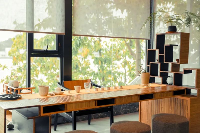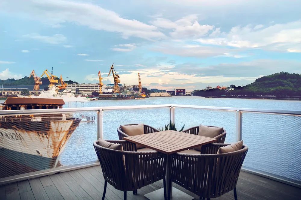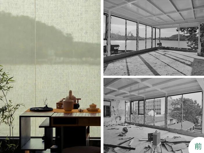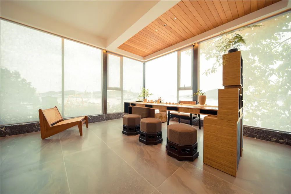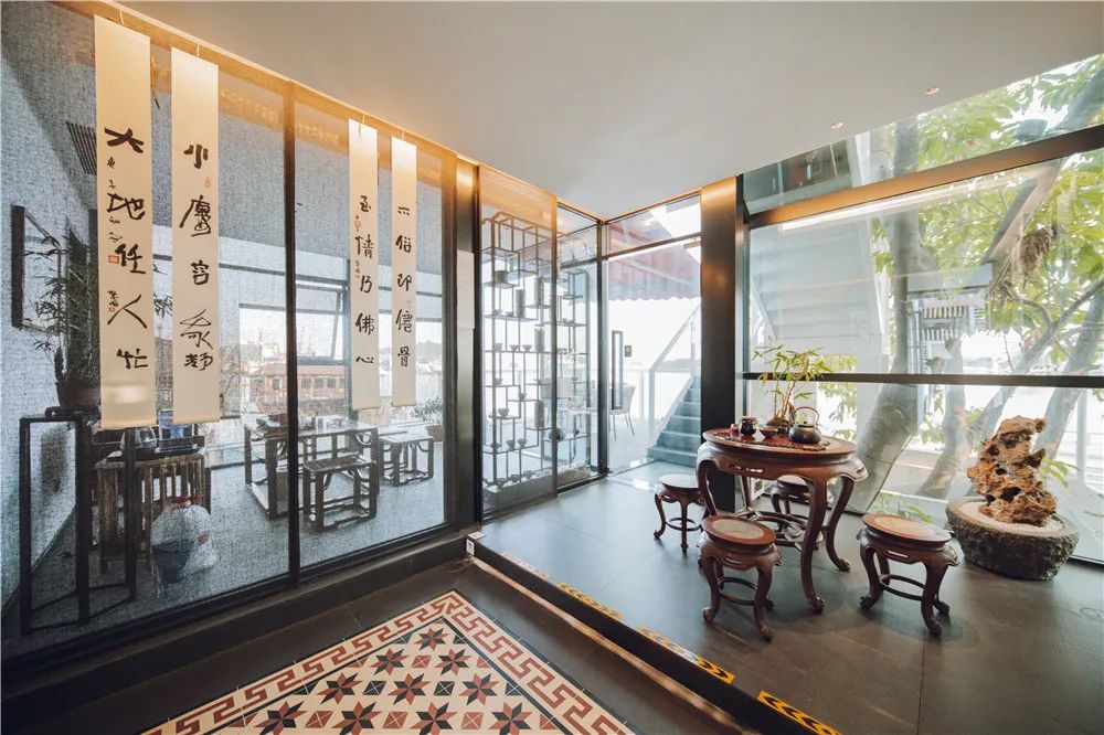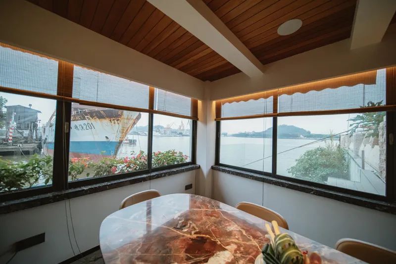 二樓的陽(yáng)臺(tái)和玻璃茶室,可以說(shuō)是整個(gè)空間最受歡迎的地方,岸邊的古老船舶和破敗的車間、遠(yuǎn)處的長(zhǎng)洲島、隱約期間的黃埔軍校、紅磚墻的大學(xué)城、奔流不息的江水、云卷云舒的天空,無(wú)一不表達(dá)出熱愛(ài)和親近自然,并融入自然的設(shè)計(jì)理念。