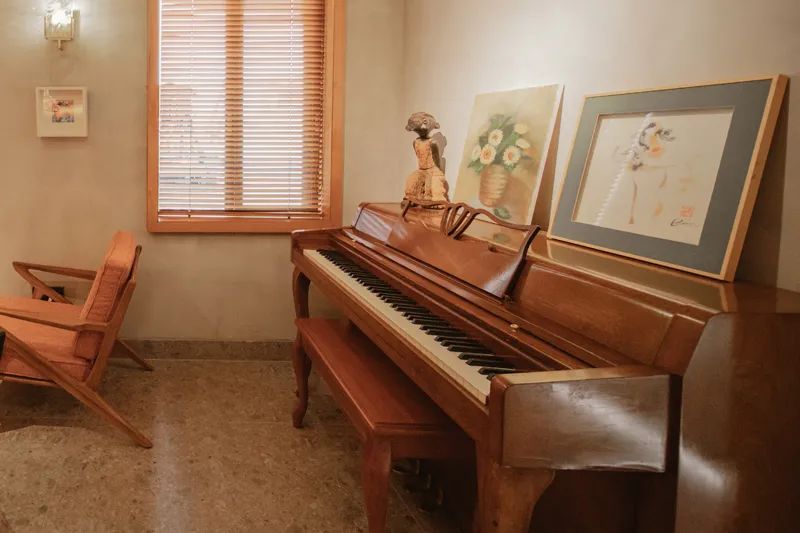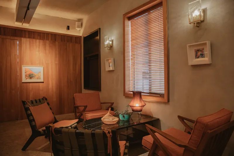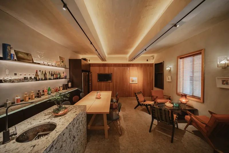 一樓多功能空間局限于原有層高的限制,天花經(jīng)過(guò)簡(jiǎn)單修復(fù),保留了原有的水泥預(yù)制板的粗獷質(zhì)感,配合空間里老式鋼琴、復(fù)古座椅、木質(zhì)墻體以及原木長(zhǎng)桌等元素,營(yíng)造出工業(yè)鐵漢般的柔情氛圍,如果不就著鋼琴曲喝一杯威士忌,都感覺(jué)白來(lái)了這個(gè)空間。