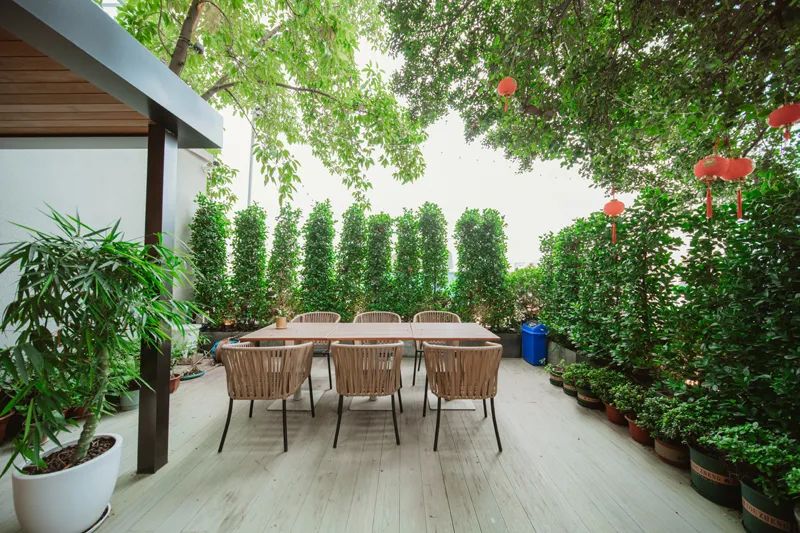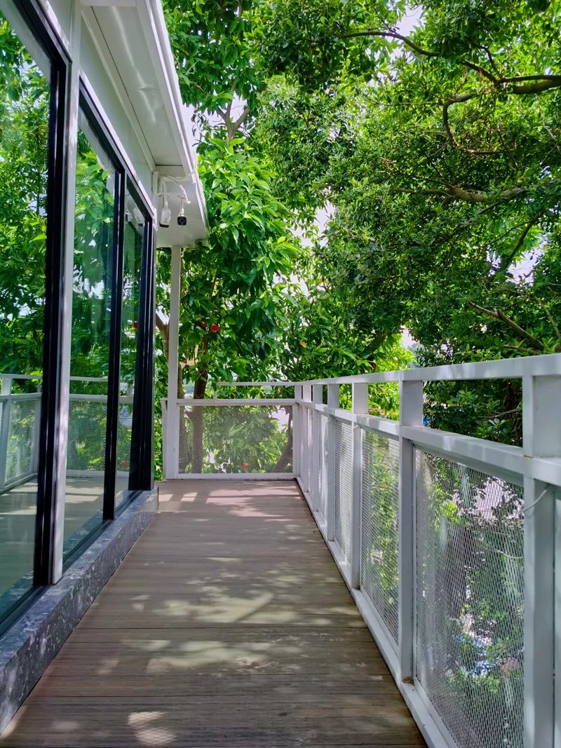 站在灰色系的戶外陽(yáng)臺(tái)木地板上向院子里俯視,感受一下上帝的視覺(jué)和對(duì)自然的敬畏感。