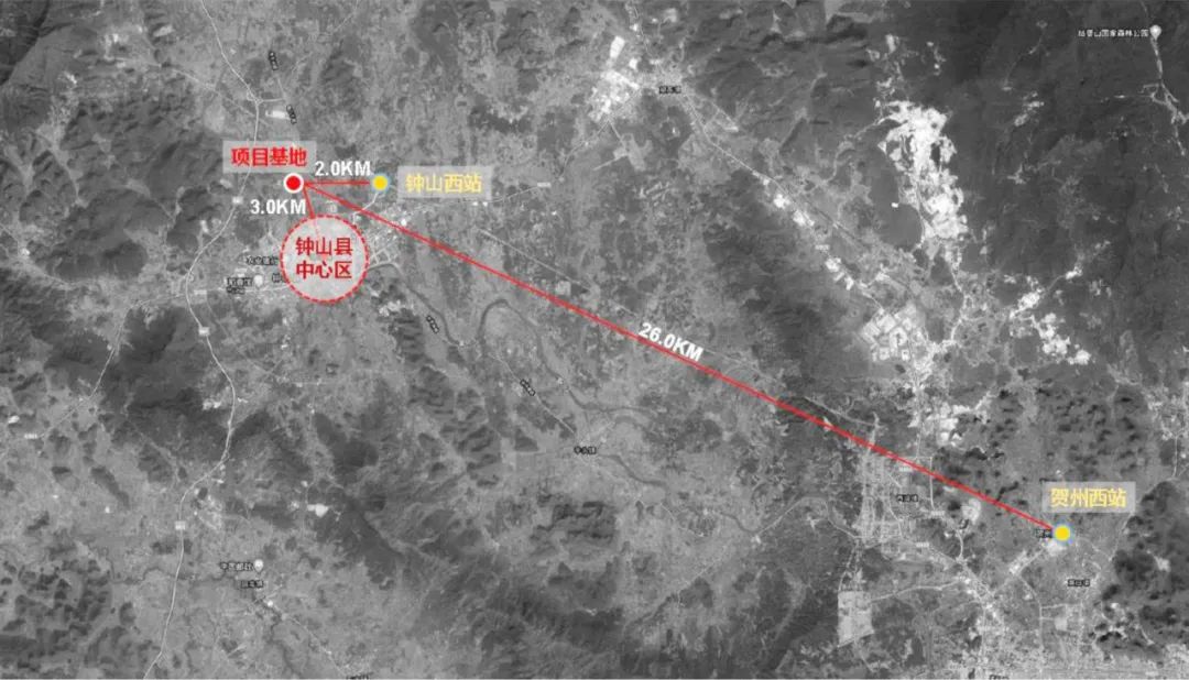 項目位于廣西省賀州市鐘山縣,距離鐘山縣中心區(qū)約3公里。處于高鐵站點鐘山西站2.8公里輻射范圍內(nèi),地塊東臨工業(yè)大道,南臨界河道形狀呈梯形,自然環(huán)境優(yōu)越,交通便利。