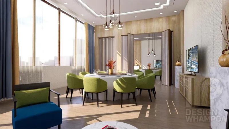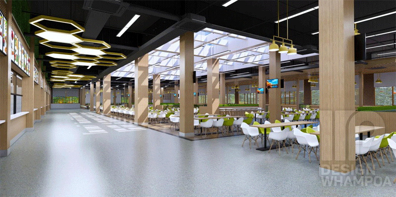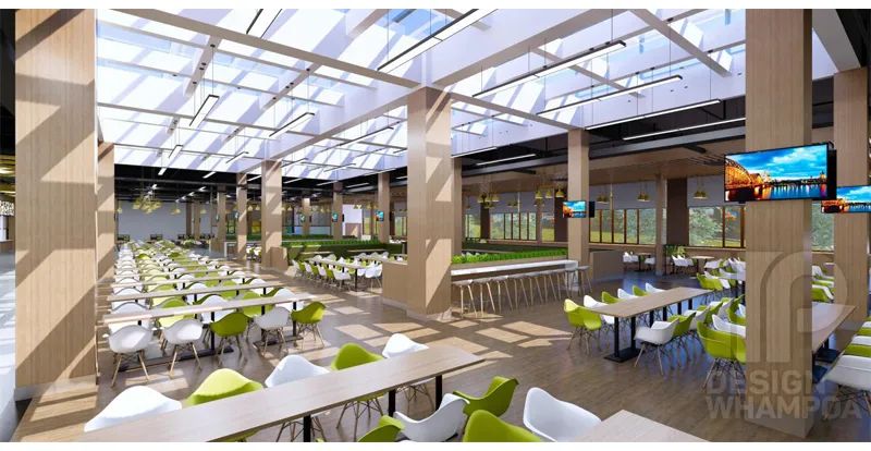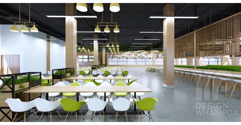 二樓作為美食城,將融合南北風味,異國風情為一體,因此座椅成圍合狀設(shè)置,并設(shè)置舒適的卡座,為學生以及師生創(chuàng)造良好的交流空間與就餐環(huán)境。設(shè)計上以綠色為主題,綠色餐椅與木紋色柱子,吊燈等體現(xiàn)出親近自然,熱愛生活的情懷,使學生在就餐的同時感受健康向上的校園文化。