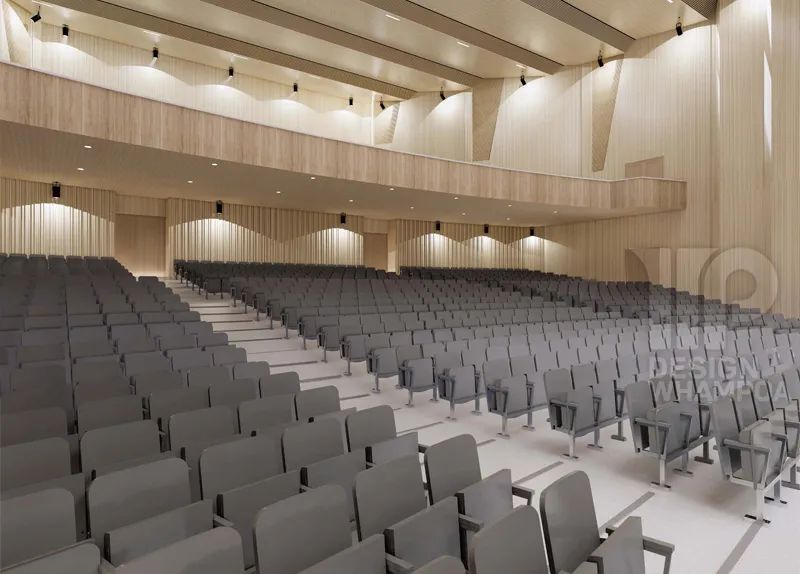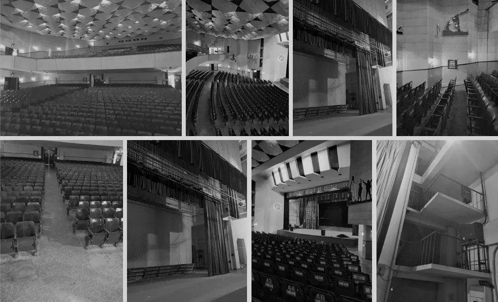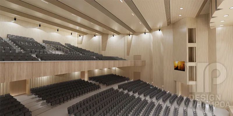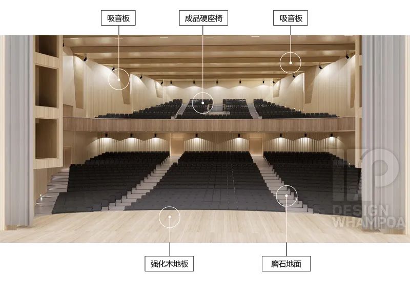 墻面和屋頂改為吸音板,觀眾席改為灰色硬椅,地面為灰白色水磨石整體地面。讓建筑更加具有厚重感儀式感,空間的現(xiàn)代化氣息,有朝氣,充滿藝術(shù)氛圍。