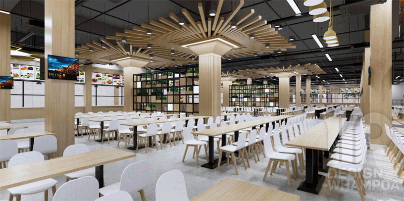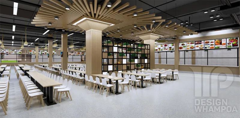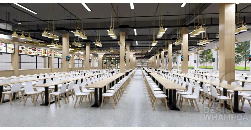 整體基調(diào)定為淺色系,搭配跳躍而鮮明色彩的軟裝和燈光系統(tǒng),使整個空間溫馨舒適,簡潔大方、又不失時尚靈動,綠色環(huán)保,不僅不利于改善學生就餐體驗,增加其幸福感與歸屬感,同時也有利于提高食堂工作有序性和積極性。