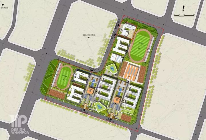 規(guī)劃總用地:173304.5㎡,學生人數(shù):5280 人,總建筑面積:138957㎡
